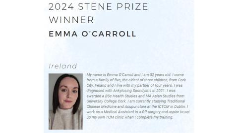 Geen podiumplaats voor onze Belgische inzending van Natacha Laeremans voor de Stene Prijs van EULAR, de Europese alliantie van reumaverenigingen. Emma O'Carroll uit Ierland werd uitgekozen als beste inzending van 2024. Haar inspirerende getuigenis lees je hier. Hilde Koning uit Nederland (haar tekst lees je hier) en Marija Kosanovic uit Servië (lees haar tekst hier) vervolledigden het podium.